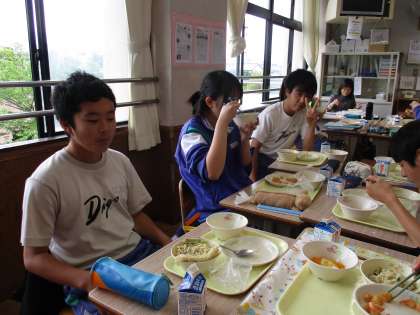 写真は、2年1組と3年4組の給食時間です。