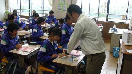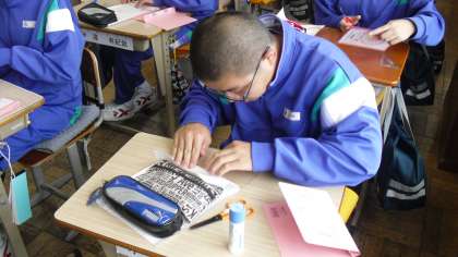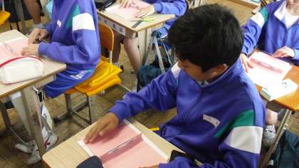自然教室のしおりを作っていました。表紙絵として選ばれた作品をファイルにマルチコートで定規を使いながら上手に貼っていました。この後、色上質紙に印刷された各係からのプリントの綴じ込み、読み込みが予定されています。
