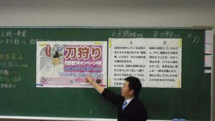 歴史の授業でした。扱ったのは豊臣秀吉です。天下統一のため行った太閤検地、刀狩りについて、秀吉はどちらから行ったのかを考えることから、秀吉の人柄、政策等核心の部分に入っていきました。