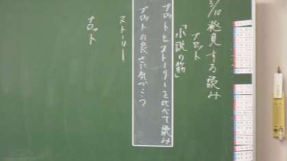今日の課題は「プロットとストーリーを比べて読み、プロットのよさに気づこう」です。プロットとは、ストーリーについて因果関係を与えた解釈になりますが、プロットを考えながら読むことによって、奥の深い理解や批判的思考を育てることができ、より広い読解が可能になることを学びました。