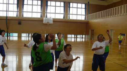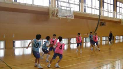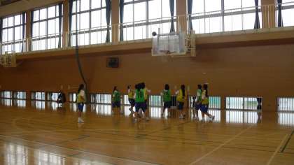 1年4組 体育の授業です。バスケットボールをやっていました。本時の課題は、「チームに合った攻め方、チームに合った守り方にはどんなものがあるか?」です。参観したときには、男女に分かれて試合を行っていました。ディフェンスは、マンツーマンディフェンスで守っていましたが、ノーマークができると、身方から「○○さんのディフェンス、誰〜」と大きな声が飛び交っていました。いい汗を流すことができたようです。
