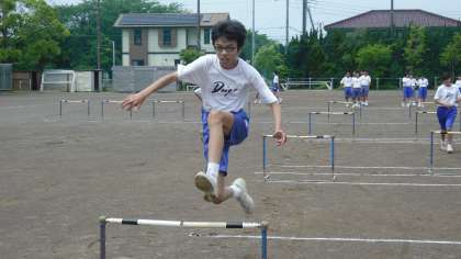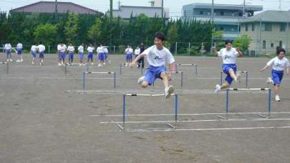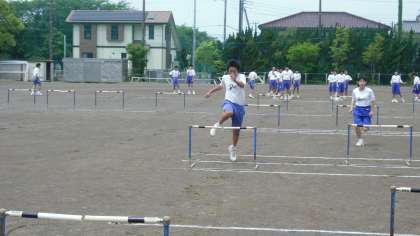2年2組 体育の授業です。今日は、ハードルの授業に入って10時間目、最期の授業です。写真はこの後行われる記録会前の練習の風景です。どの生徒も抜き足まで注意を払い、上手に跳んでいました。果たして自己ベストが出せたでしょうか?