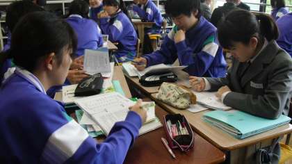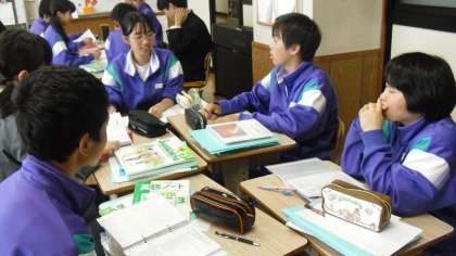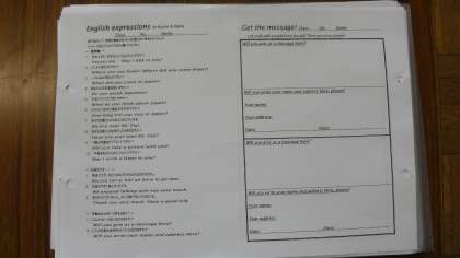 3年2組 英語の授業です。授業の最初に、来週から行く修学旅行で外国の人と積極的にコミュニケーションを図ろうと班になって会話文を確認し合っていました。