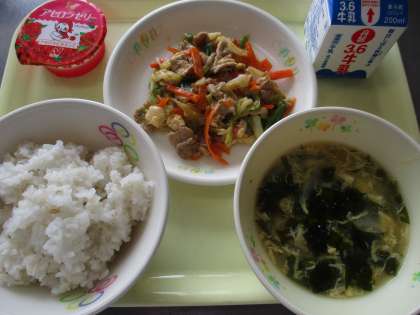 麦飯 牛乳 回鍋肉 わかめと卵のスープ アセロラゼリー