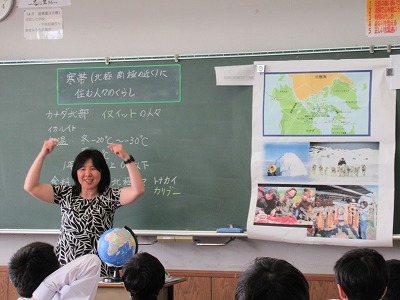 1年1組 社会の授業です。「寒帯(北極、南極の近く)に住む人々の暮らし」についての学習です。提示されている写真を見て、日本の食との違いを考えます。「なぜ生肉なの?平気なのかな?」「寒いから菌がつかないからじゃない?」など、疑問や自分たちなりの考えが飛び交っています。