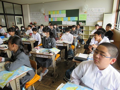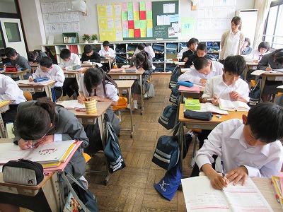 1年2組 英語の授業です。今日は、「あなたは〜ですか?」という聞き方と答え方を会話を通して学びました。最後に学んだことのまとめ、振り返りをしています。