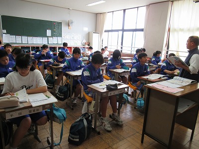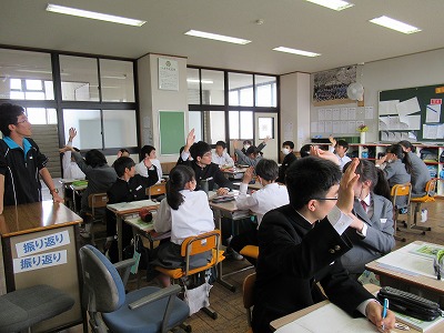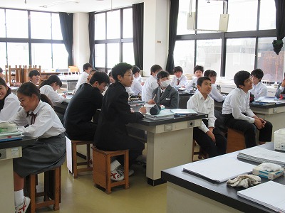 2年3組 理科の授業です。今日は「鉄と硫黄を混ぜて加熱するとどうなるか」という課題です。「硫化銅」という物質になることを確認しています。彦根先生が「固ゆでのゆで卵の黄身が黒っぽくなったところもそうだよ。」などと話すと、「え!? 本当に!?」という驚きの声が上がっていました。