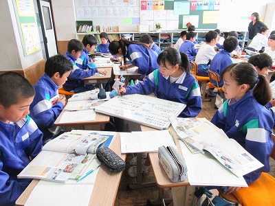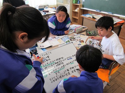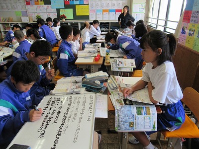 1年3組 社会の授業です。「寒帯の人々のくらしの変化」の学習です。今日は、寒帯地域の「工夫していること」「近年の変化」「寒帯で起こっている問題点」の三点について、各班でまとめています。資料等を使いながら調べ、工夫しながら分かりやすくまとめていました。この後、各班の発表に入っていきます。
