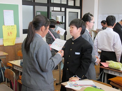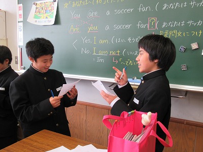1年4組 英語の授業です。今日は「『あなたは〇〇ファンですか?』と友達にインタビューしよう!」という課題です。どんなふうに尋ねるかを学んだ後、会話練習に入りました。皆、積極的に多くの友達と会話をしていました。声も大きく、会話をしている表情もとてもよかったです。
