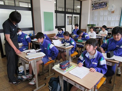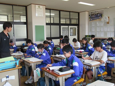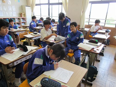 2年3組 保健体育の授業です。「健康と環境」の単元です。今日は、「快適で能率のよい生活に適した気温や明るさは、どのようなものだろう。」という課題です。「気温、湿度、気流」が関係している「温熱条件」、快適に能率よく活動するために適した範囲「至適範囲」などの用語の学習とともに、実生活の中での場面とを結びつけて考えていきました。