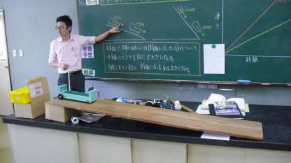 3年3組 理科の授業です。今日の課題は「台車に働く力と速さの関係を説明しよう」です。参観したときには、個々に自分の考えをノートに書き留めていました。困っている生徒も何人か見受けられましたが、TTの授業ということもあり、個々の疑問に対してきめ細やかな支援が可能となっていました。