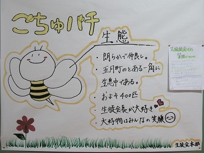 今年度前期生徒会のスローガン「ごちゅバチ」が掲示されています。生態などが書かれています。発想がユニークですね。