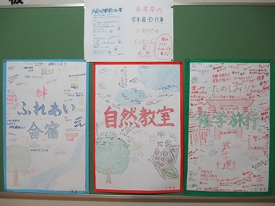 「ごちゅバチ」の横には、各学年の行事に向けて、たくさんのメッセージが書かれています。仲間、後輩、先輩へのエールです。このような言葉の交流、素敵ですね。