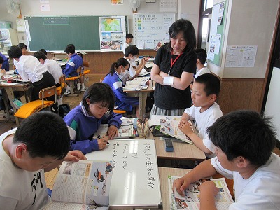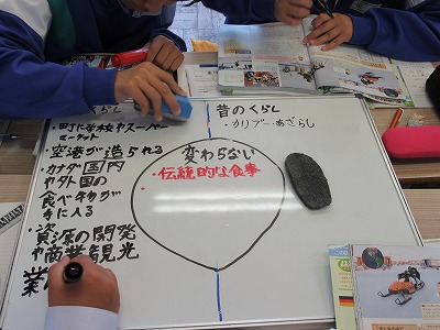 1年1組 社会の授業です。寒帯に住むイヌイットの人々のくらしの変化について、「昔」と「今」とに分けてまとめています。