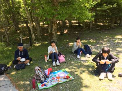 ウォークラリー前半組が、設置された問題を解いています。良い場所を見付けたら、お昼休憩。班のみんなで協力して、高得点を目指しましょう。