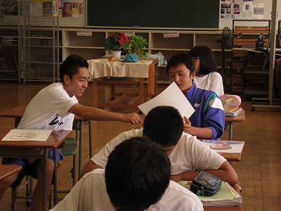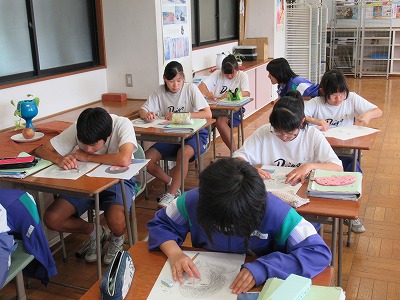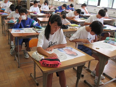 3年4組 美術の授業です。自分の内面を表す自画像に取り組んでいます。以前に撮影した写真を基に、これまでに身に付けてきた様々な技法を用いて、表現しています。