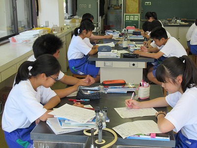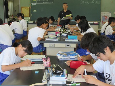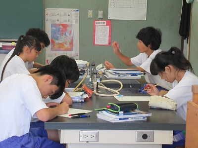 2年4組 理科の授業です。単元のまとめの時間です。写真は、ワークシートの確認をしているところです。テストも近いです。これまでの復習を確実にしておきましょう。