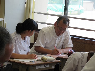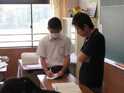 3年1組 数学の授業です。因数分解等のまとめの時間です。露木先生に加え、植松教頭と内山先生も授業に入って、個人個人の質問に丁寧に応えています。
