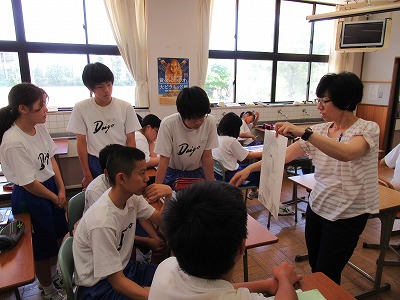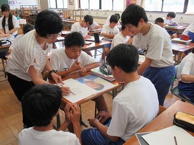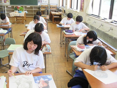 3年3組 美術の授業です。自画像「今の私、本当の私」に取り組んでいます。今日は、立体感を考えて仕上げていきます。目、髪、耳、口の描き方のポイントを押さえながら描いています。世古先生のアドバイスを参考に、仕上げに磨きをかけている生徒の姿も見られました。