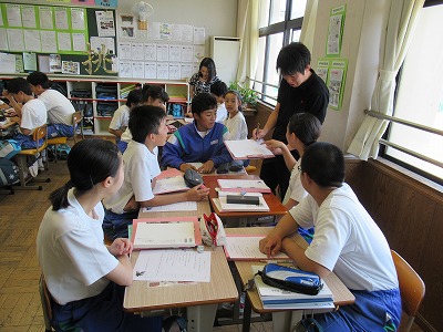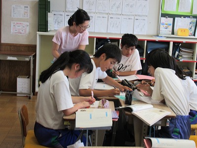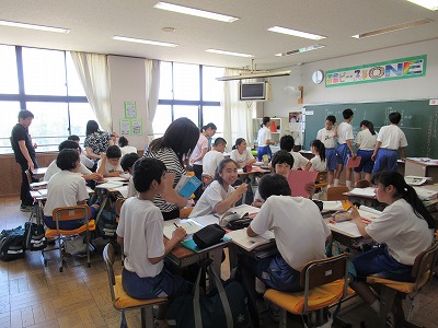 今年度本校では、週に1時間、時間割の中に教科(教科群)ごとの打合せの時間を設けています。今日は、国語部が2年1組の和田先生の授業を参観し、事後研修を行いました。写真は、国語部の先生方が参観している様子です。