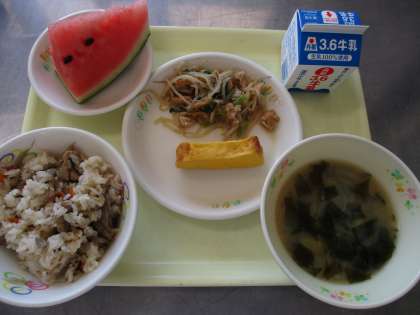 五目ごはん 牛乳 厚焼き卵 煮浸し たまねぎとじゃがいものみそ汁 すいか