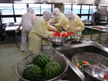 大岡中、五中あわせて32個のすいかを切りました。