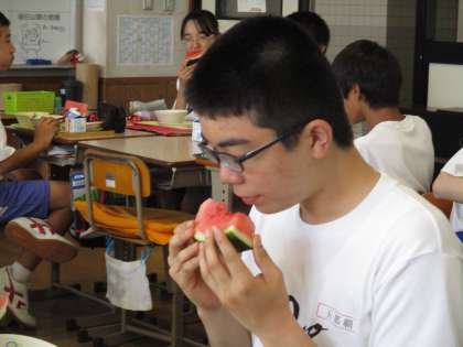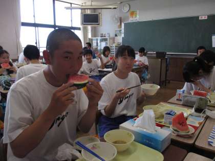 写真は、2年4組です。おいしそうにすいかを食べています。