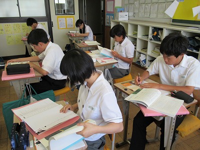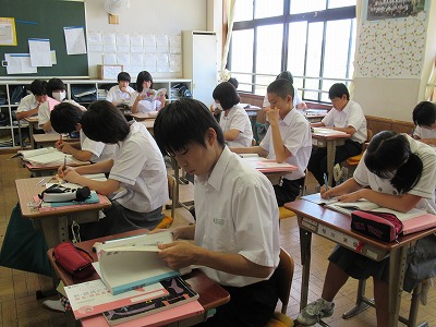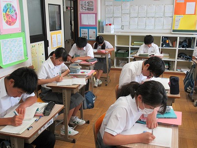 「握手」の最後の場面です。今日は、「せわしく打ちつけた私の心情」を今までの内容を踏まえて、文章全体を捉えながらまとめていきました。まとめ終えた生徒は、学習ワークのまとめをしています。