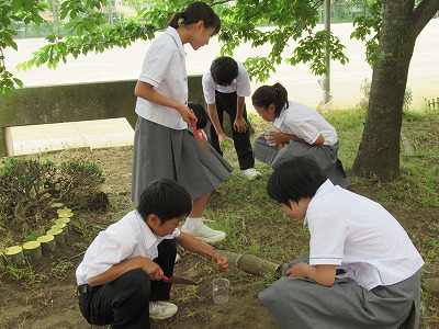 今日は植物の根がどうなっているかを観察する時間です。まずは、校庭で自分たちが調べる草を採取します。どれにしようか、ペアで話ながら探しています。この後、採取した草を観察していきますが、「はやく顕微鏡をのぞきたい!」というわくわくした気持ちが伝わってきました。