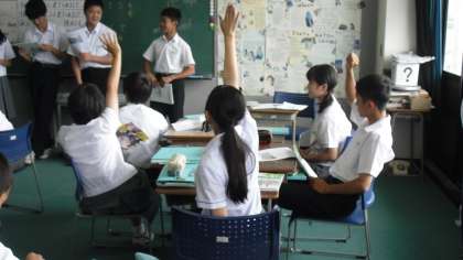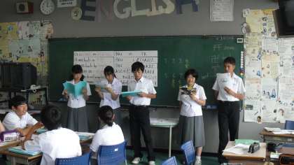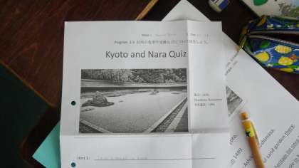 今日の課題は「京都・奈良を紹介するクイズを作ろう」です。班で、京都・奈良の神社仏閣や名跡からクイズにするところを一つ決め、5つのヒントを英文で考え、班ごとに順番に黒板の前に出て発表していました。発表を聞いていた生徒は、ヒントを手がかりにその場所がどこなのかを考え、挙手をし答えていました。