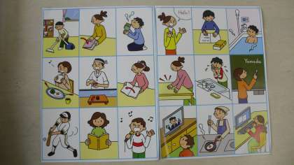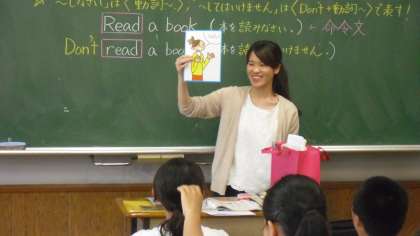 命令文の学習です。坪谷先生がピクチャーカードを掲げると、間髪入れずに生徒から大きな声で答えが返ってきます。顔を洗う絵が提示されると「Wash your face.」、テレビを見る絵が提示されると「Don’t watch TV.」と答えています。覚えた英文を言いたくてしょうがない生徒の思いが伝わってきました。楽しみながら一生懸命取り組んでいました