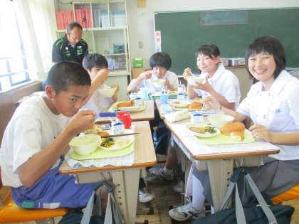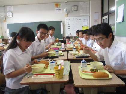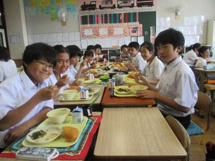 スプーンを上手に使って、笑顔で上品に食事をしている1年4組のみなさんです。
