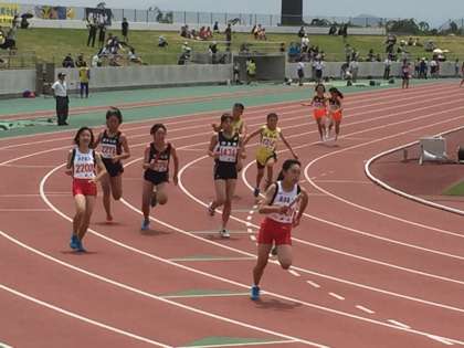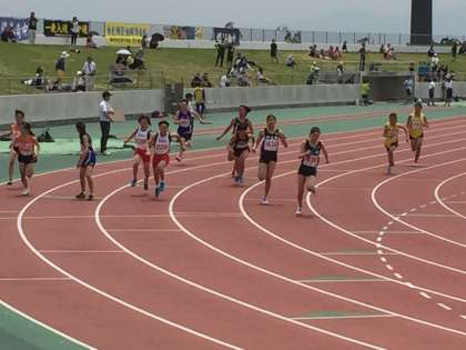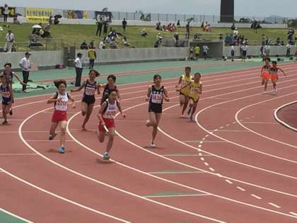 女子低学年4×100mR予選です。佐藤ひさん、大嶋さん、佐藤あさん、小林さんの4人でバトンを繋ぎました。