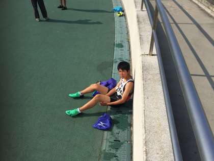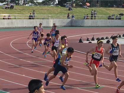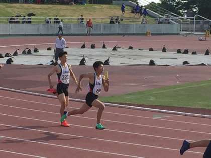 男子低学年4×100mR決勝に、尾崎さん、金子さん、神南さん、田代さんが出場しました。写真は、尾崎さんから金子さんへのバトンの受け渡しの場面です。