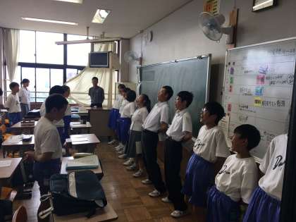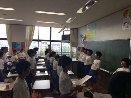 3年生激励会の応援練習です。2年生の学級三役が1年生の教室で応援の仕方を教えています。