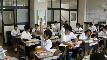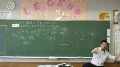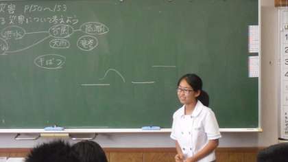 本時の課題は、「気候などと関連する災害について考えよう」です。参観したときには、山田さんと篠原さんが、高潮と津波の違いについて説明をしていました。また、授業後半には、火山活動は人間に被害を与えるとともに間接的に人間に多くの裕福をもたらすことをクラス全体で確認し合いました。