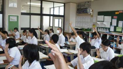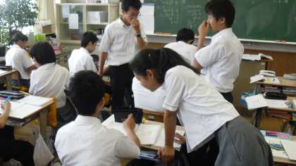 今日は、連立方程式加減法の学習です。前時までは、単純にたすか引けば、どちらかの文字が消去されるタイプでしたが、本時はワンランクレベルが上がって、一方もしくは両方ともに、何倍かしなければ係数がそろわないタイプでした。参観したときには、近くで教え合いをしていました。杉本君は、ヒントを出すのに、相手に考える余地を残すために、ストレートに全部言わず、「両方なんとかするといいよ」と言っていました。彼流の優しさが感じられる一幕でした。