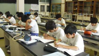 参観したときには、木曜日からの期末テストに備え、仕事の原理について復習していました。合力、分力、斜面上の力の作図を扱い、作図を通して、斜面の角度を大きくすると斜面に沿う力は大きくなることを、確認し合っていました。