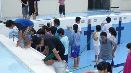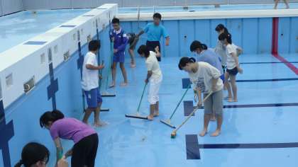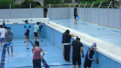 再来週からの水泳の授業に備え、プール掃除を行いました。床や側面をデッキブラシやたわしを使い、きれいに磨きました。10ヶ月の間に溜まった汚れもきれいに取り除かれ、見違えるようになりました。今週末には水を入れ始め、プール開きを待つことになります。