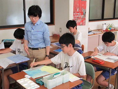 風景画に取り組んでいます。自分だけの風景にするためには、「楽しい」「懐かしい」「淋しい」「迷いのある」など自分自身の描きたいイメージをはっきり持つことが大切であることを学んだことで、それぞれが自分自身のイメージを色で表し始めました。そのイメージを大切にしつつ、さらに「遠近感、奥行き感を色でどう表現すればよいのか」も考えていきます。様々な技法が示されています。自分のイメージに合わせて技法も使い分けていきます。