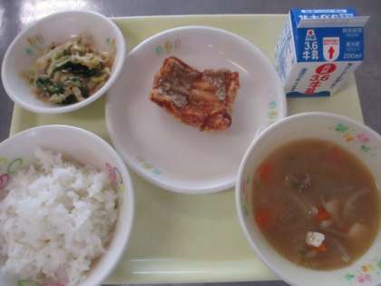 米飯 牛乳 太刀魚の唐揚げ キャベツとほうれんそうのごま和え 豚汁