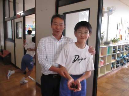 写真上は、昨日の給食で提供したびわの種を、1年生の生徒が手に持って宇野先生と撮ったものです。下の写真の女子生徒も、びわの種を手に持っています。