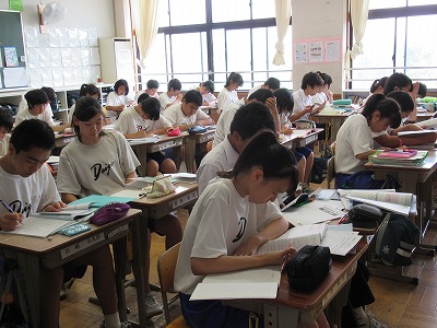 3年2組は学級目標の掲示物を貼ったり、テスト勉強したりしていました。