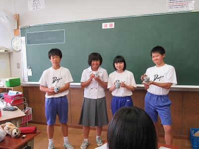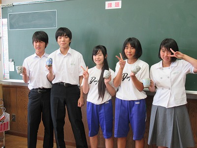 3年3組は修学旅行で絵付けした湯飲みを配布し、記念撮影をしていました。