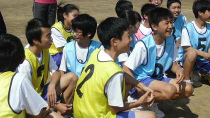 ビブスを着ている生徒が、追いかけ役の警察です。これから一生懸命追いかけます。