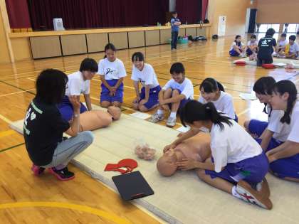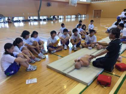 発見から胸骨圧迫までの動きを教わっています。