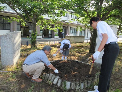 福祉委員と用務員の杉山さんが花壇の土ほぐしをしていまいた。