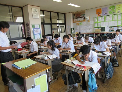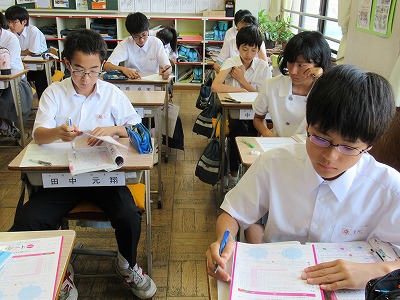 テスト返却後、「平成29年度全国体力・運動能力、運動習慣等調査」を行いました。実技に関する調査は、先日行われた新体力テストの結果を基に記入をしました。質問紙調査には32の質問に回答していきました。1「運動(体を動かす遊びを含む)やスポーツをすることは好きですか」、2「自分の体力・運動能力に自信がありますか」、3「あなたにとって運動(体を動かす遊びを含む)やスポーツは大切なものですか」などの質問がありました。