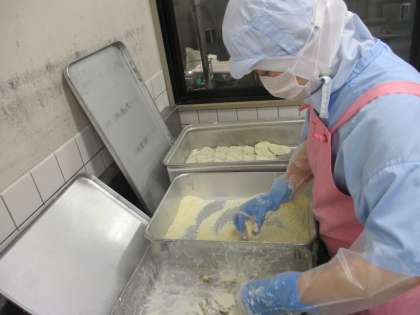 1枚目は、黒はんぺんに衣をつけている様子です。
