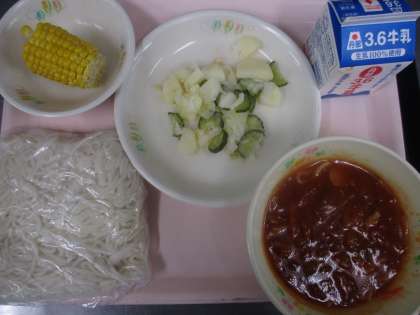 つけナポリタン(富士市ご当地グルメ)牛乳 ポテトと野菜のサラダ ゆでとうもろこし